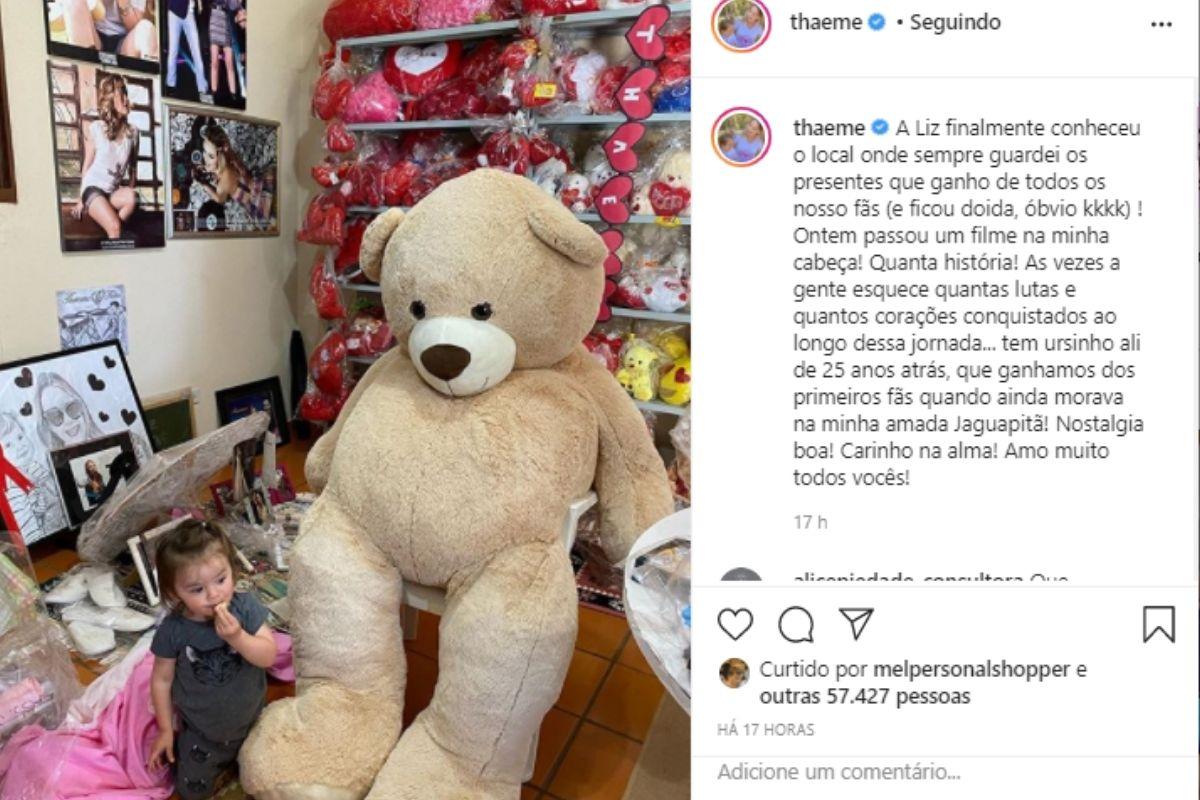 “A Liz finalmente conheceu o local onde sempre guardei os presentes que ganho de todos os nosso fãs (e ficou doida, óbvio hahaha) ! Ontem passou um filme na minha cabeça! Quanta história! As vezes a gente esquece quantas lutas e quantos corações conquistados ao longo dessa jornada… tem ursinho ali de 25 anos atrás, que ganhamos dos primeiros fãs quando ainda morava na minha amada Jaguapitã! Nostalgia boa! Carinho na alma! Amo muito todos vocês!”, escreveu a cantora junto à imagem.