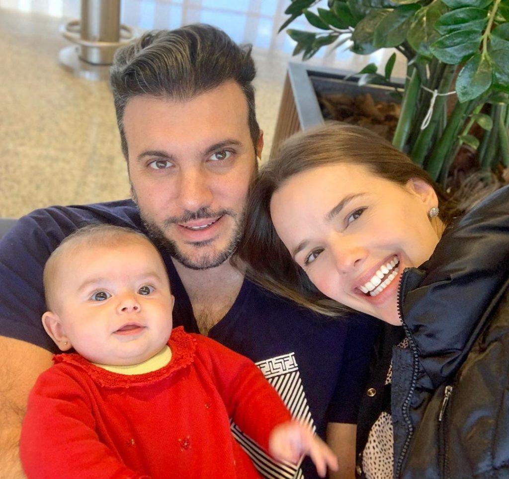 Ao postar selfie ao lado da bebê e do marido, o empresário Fábio Elias, ela escolheu uma música da cantora Sandy para colocar na legenda. “Sorri, pra mim; Não deixa o sol se pôr; Aqui estou querendo parar o tempo; E não desistir