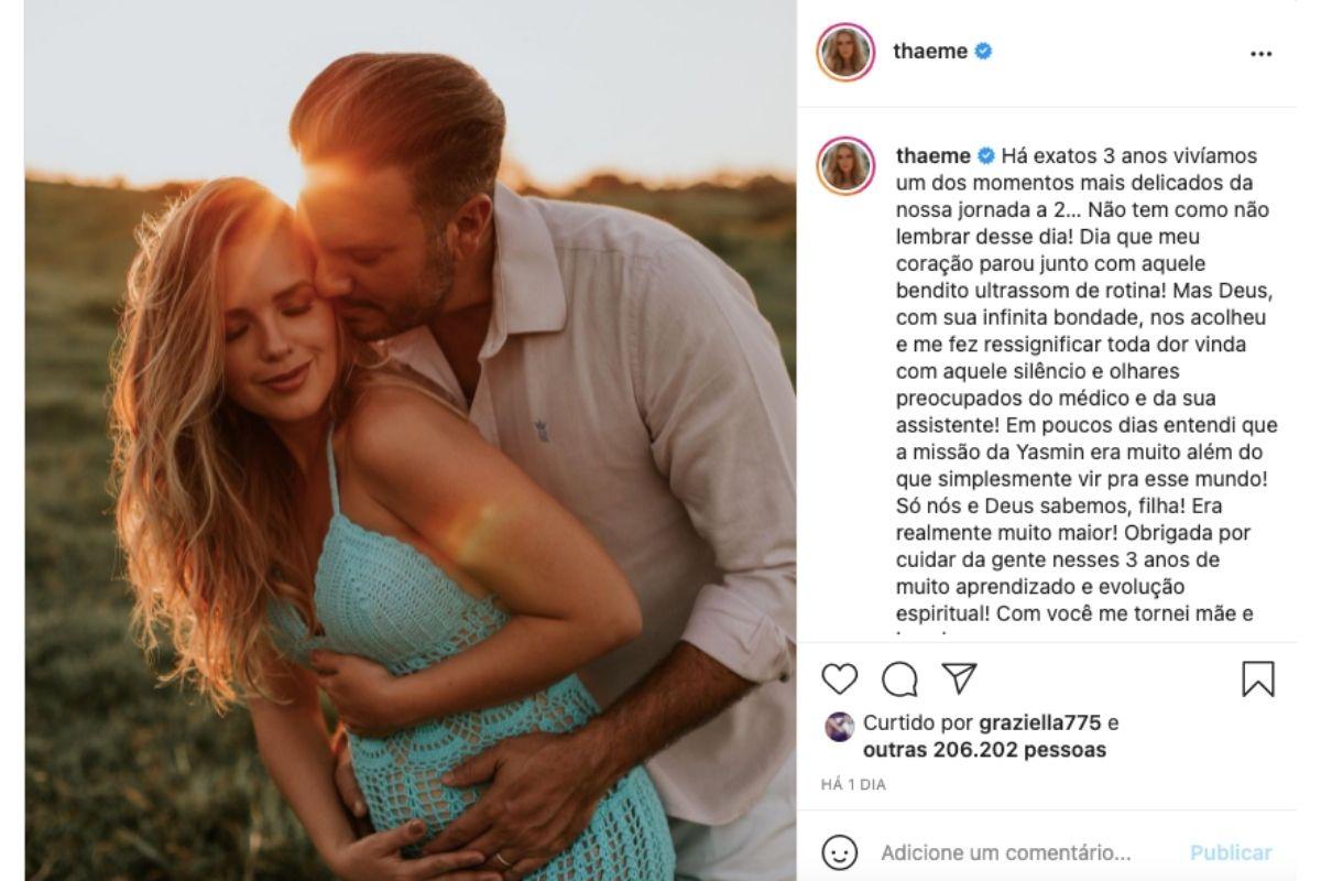 Neste sábado, 22 de maio, Thaeme relembrou um momento triste durante sua trajetória enquanto mãe. O aborto espontâneo que a cantora teve foi antes da gravidez bem-sucedida da segunda filha, Liz. Hoje em dia, a famosa está grávida de Ivy, fruto do relacionamento com Fábio Elias.