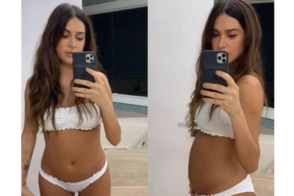 Para falar sobre o assunto, ela mostrou a barriga de frente e de lado. Ao comentar sobre o assunto, a atriz comentou que ela pode parecer pequena, mas para a genética e corpo que costuma ter, as mudanças são aparentes.