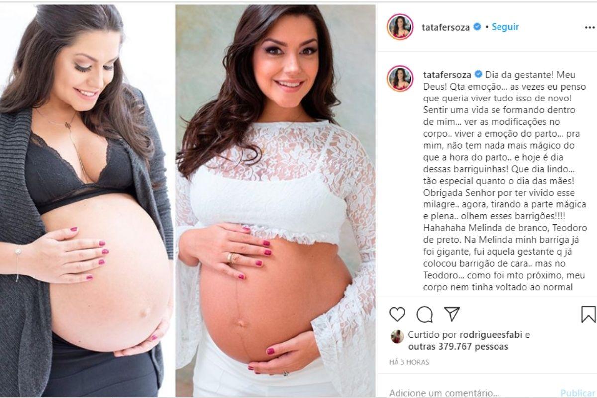 “Dia da gestante! Meu Deus! Quanta emoção… às vezes eu penso que queria viver tudo isso de novo! Sentir uma vida se formando dentro de mim… ver as modificações no corpo… viver a emoção do parto… pra mim, não tem nada mais mágico do que a hora do parto… e hoje é dia dessas barriguinhas!”, começou na legenda da postagem.