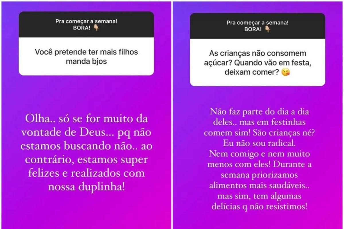 “As crianças não consomem açúcar? Quando vão em festa deixam de comer?”, questionou outra. “Não faz parte do dia a dia deles, mas em festinhas comem sim. São crianças, né? Eu não sou radical. Nem comigo, nem muito menos com eles. Durante a semana priorizamos alimentos mais saudáveis. Mas, sim, tem algumas delícias que não resistimos!”, explicou a atriz.
