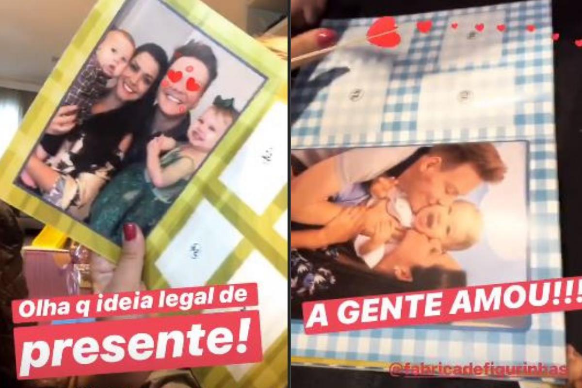 Ao lado do marido, o cantor sertanejo Michel Teló, e dos filhos Melinda e Teodoro, de 3 e 2 anos, a atriz abriu o álbum e ajudou os filhos a colarem as figurinhas. “É um álbum com fotos nossas e nós somos as figurinhas!”, explicou a atriz. “Não conhecia! Legal demais! Que presente incrível”.