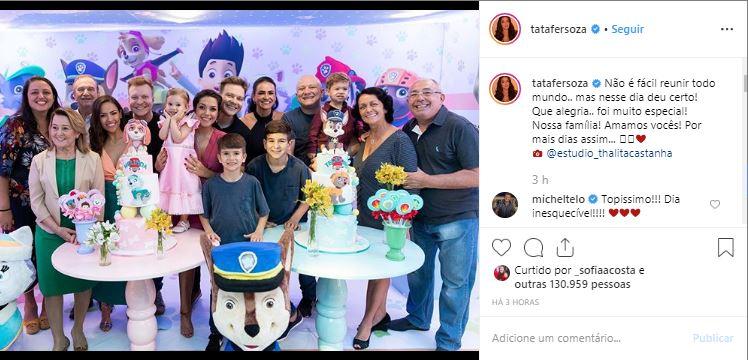 Na terça-feira, 13 de agosto, Thais publicou no Instagram uma foto com a família completa na mesa do bolo. Na legenda da publicação, a atriz falou sobre a dificuldade de juntar toda a família e de como aquele momento foi especial: “Não é fácil reunir todo mundo, mas nesse dia deu certo! Que alegria… Foi muito especial! Nossa família! Amamos vocês! Por mais dias assim…”