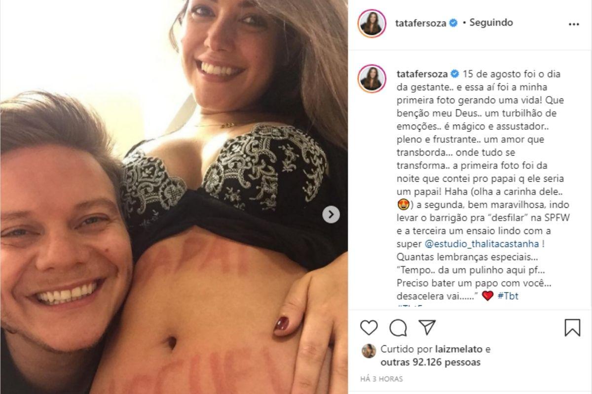 Logo em seguida, Thais explicou um pouco sobre a escolha das fotos e contou o momento em que elas foram tiradas. “A primeira foto foi da noite que contei pro papai q ele seria um papai! Haha (olha a carinha dele.. ) a segunda, bem maravilhosa, indo levar o barrigão pra “desfilar” na SPFW e a terceira um ensaio lindo!”, seguiu ela, relembrando os momentos.