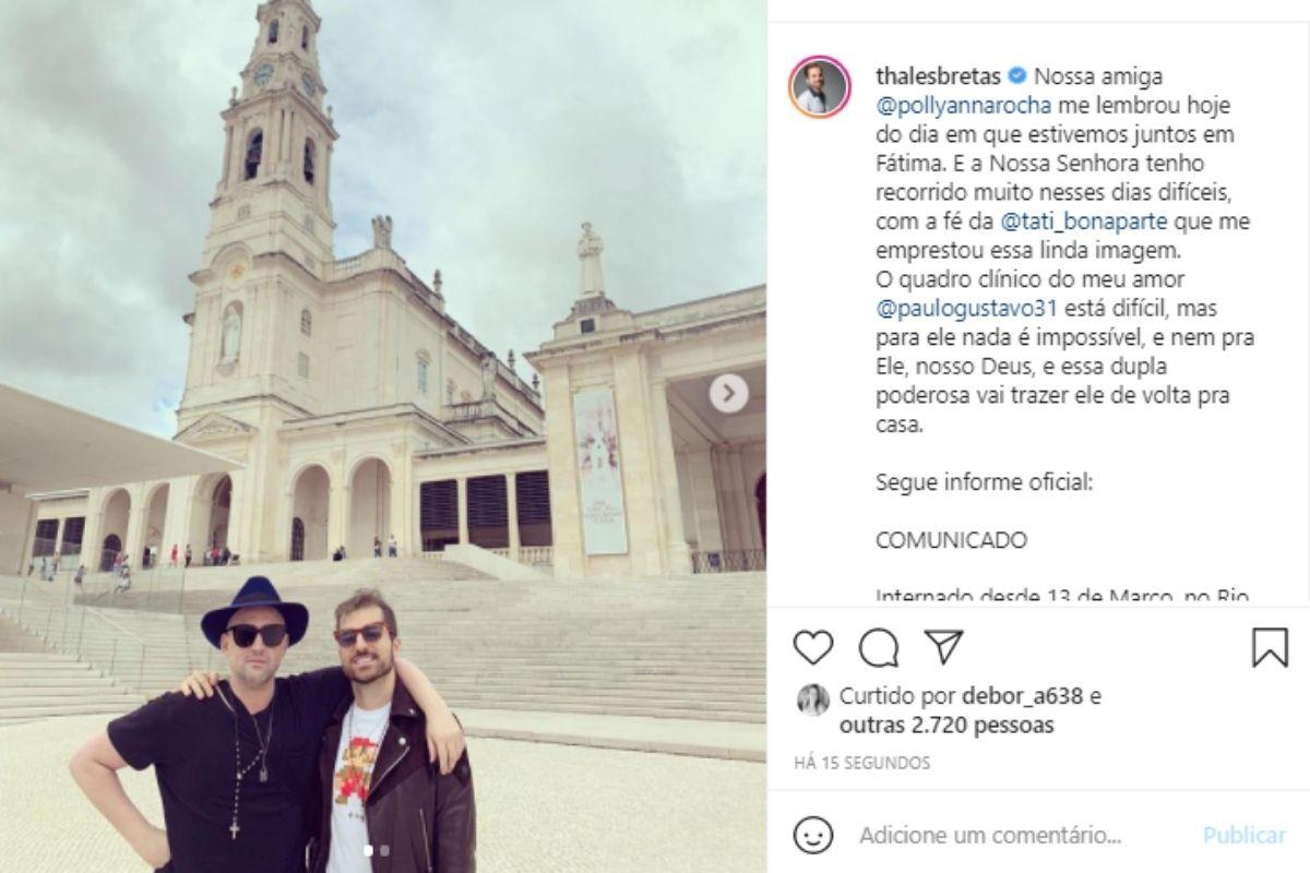 Na imagem, Thales e Paulo Gustavo aparecem abraçados em frente a um ponto turístico da cidade. “Nossa amiga @pollyannarocha me lembrou hoje do dia em que estivemos juntos em Fátima. E a Nossa Senhora tenho recorrido muito nesses dias difíceis, com a fé da @tati_bonaparte que me emprestou essa linda imagem”, escreveu ele.