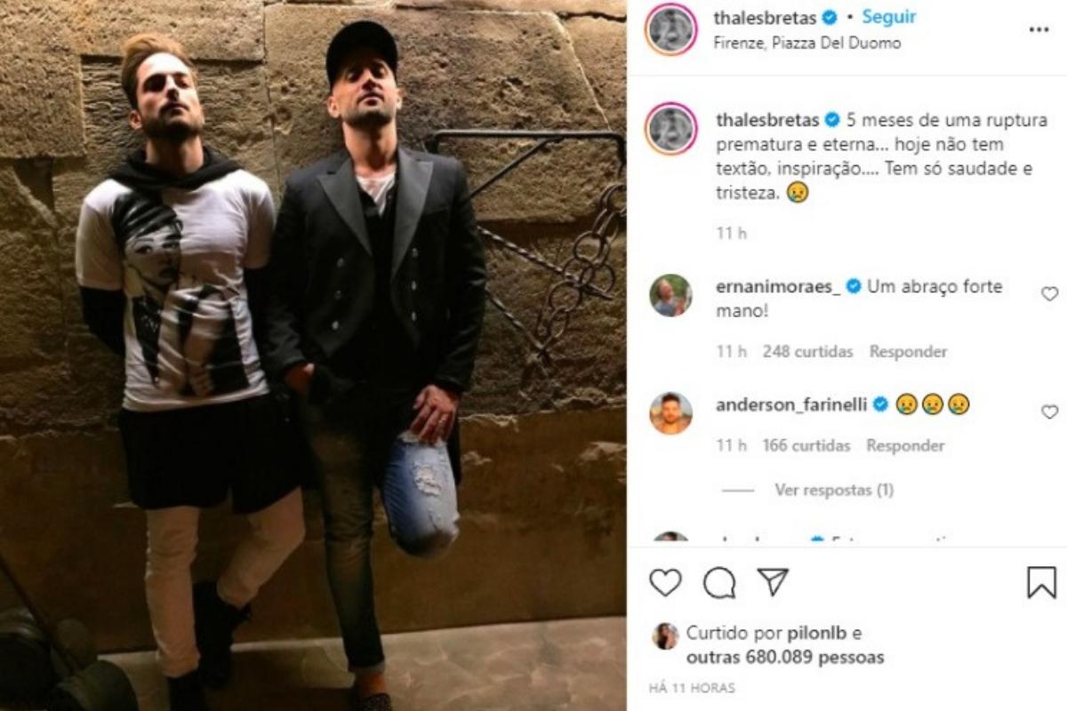 “Esse homem que amo tanto, pai dos nossos filhos. Sinto muita saudade e angústia por não continuar esse projeto de vida que tanto sonhei. Não foi fácil e a gente teve que romper muitas barreiras. Espero continuar para que outras pessoas possam viver seus sonhos. O amor move montanhas mesmo. Espalhem amor por aí, porque o mundo precisa demais”, finalizou Thales.