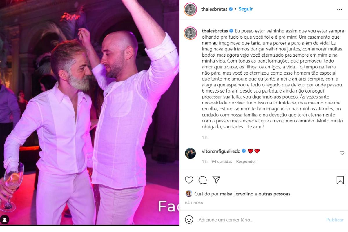 “6 meses se foram desde sua partida, e ainda não consegui processar sua falta, vou digerindo aos poucos. Às vezes sinto necessidade de viver tudo isso na intimidade, mas mesmo que me recolha, estarei sempre te homenageando nas minhas atitudes, no cuidado com nossa família e na devoção que terei eternamente com a pessoa mais especial que cruzou meu caminho! Muito muito obrigado, saudades… te amo!”, concluiu Thales na postagem.