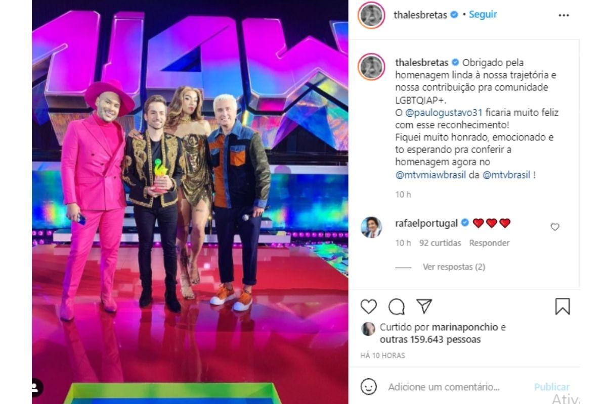 Além do discurso, Thales também fez uma publicação no Instagram para agradecer aos fãs pelo carinho e, mais uma vez, reforçar o amor por Paulo e toda a família. “Obrigado pela homenagem linda à nossa trajetória e nossa contribuição pra comunidade LGBTQIAP+. O @paulogustavo31 ficaria muito feliz com esse reconhecimento!”, escreveu. Confira parte do discurso abaixo.