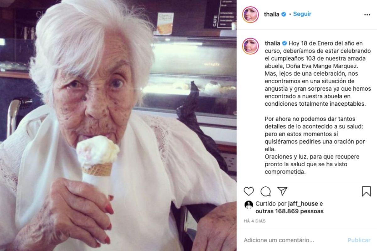 Nas redes sociais, a cantora Thalia disse que a avó de 103 anos, Eva Mange Marquez, sofreu maus-tratos no asilo em que vive no México. A estrela publicou um texto no Instagram para denunciar o estabelecimento.