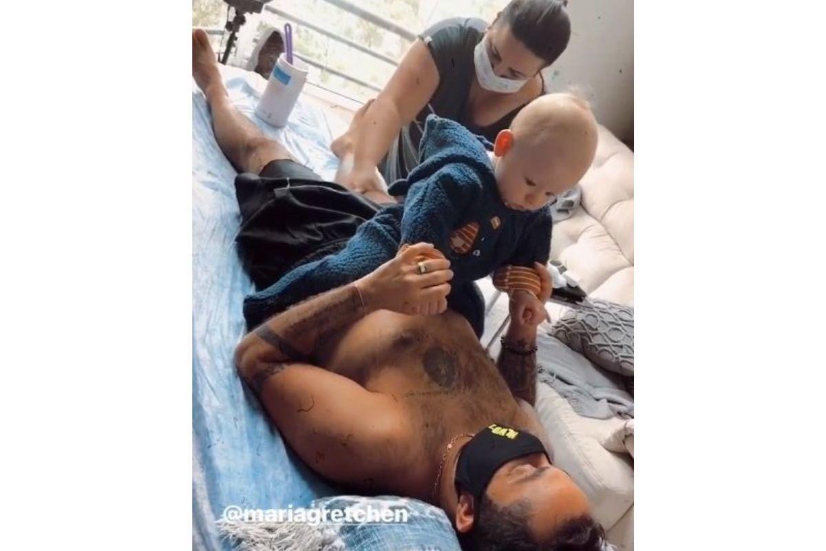 Thammy Miranda compartilhou nas suas redes sociais nesta quinta-feira, 16 de julho, o filho Bento, de 6 meses, participando de uma sessão de drenagem linfática do influencer. A imagem foi registrada por Andressa Ferreira, esposa de Thammy. O filho de Gretchen chegou a mandar um recado para a mãe: “O que te lembra isso aqui?” O influencer, então, explicou que costumava ficar sentado no colo da cantora enquanto ela recebia massagem, exatamente como o filho estava fazendo. “Ficava assim, onde ele está!”, falou ele.
