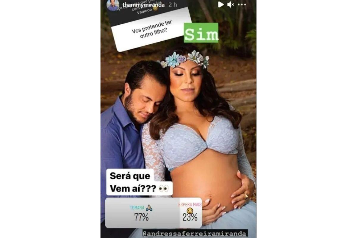 “Você pretendem ter outro filho?”, questionou o seguidor. Thammy Miranda então compartilhou uma foto do ensaio gestante que fez com Andressa Ferreira na gravidez de Bento e disse: “Sim!”. O influencer então deixou as expectativas por mais um bebê lá em cima ao perguntar: “Será que vem ai??”. Thammy ainda colocou uma enquete dos internautas diante desta pergunta e 77% dos internautas respondeu: “Tomara”.