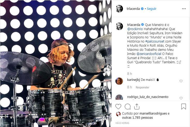 “Que maneiro é o Rock in Rio, que edição incrível. Sepultura, Iron Maiden e Scorpions e uma noite história com muito rock’n’roll! Ah, e teve o guri quebrando tudo também!”, disse o ator na legenda da publicação.