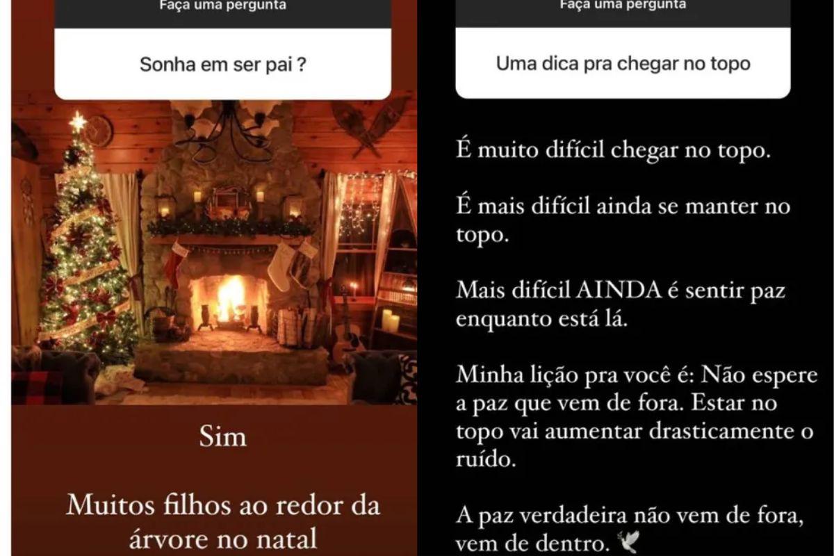 “Sonha em ser pai?”, questionou um seguidor.”Sim. [Quero] muitos filhos ao redor da árvore de Natal”, escreveu Thiago. Na sequência, um internauta pediu uma dica para chegar ao topo.”É muito difícil. É mais difícil ainda se manter no topo. Mais difícil ainda é sentir paz enquanto está lá. Minha lição para você é: não espere a paz que vem de fora. Estar no topo vai aumentar drasticamente o ruído. A paz verdadeira não vem de fora, vem de dentro”, respondeu.