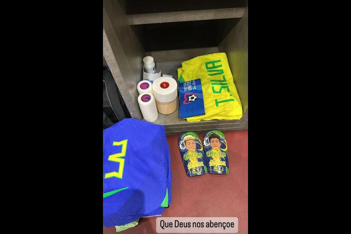 O jogador Thiago Silva, que estreou junto com a Seleção Brasileira a participação do país na Copa do Mundo nessa quinta-feira, dia 24 de novembro, mostrou os bastidores do pré-jogo em seus stories do Instagram. Ele apareceu na rede social no vestiário e contou que usaria caneleiras com os rostos dos filhos,  Isago Iago, estampados. “Que Deus nos abençoe”, desejou ele antes de entrar em campo.