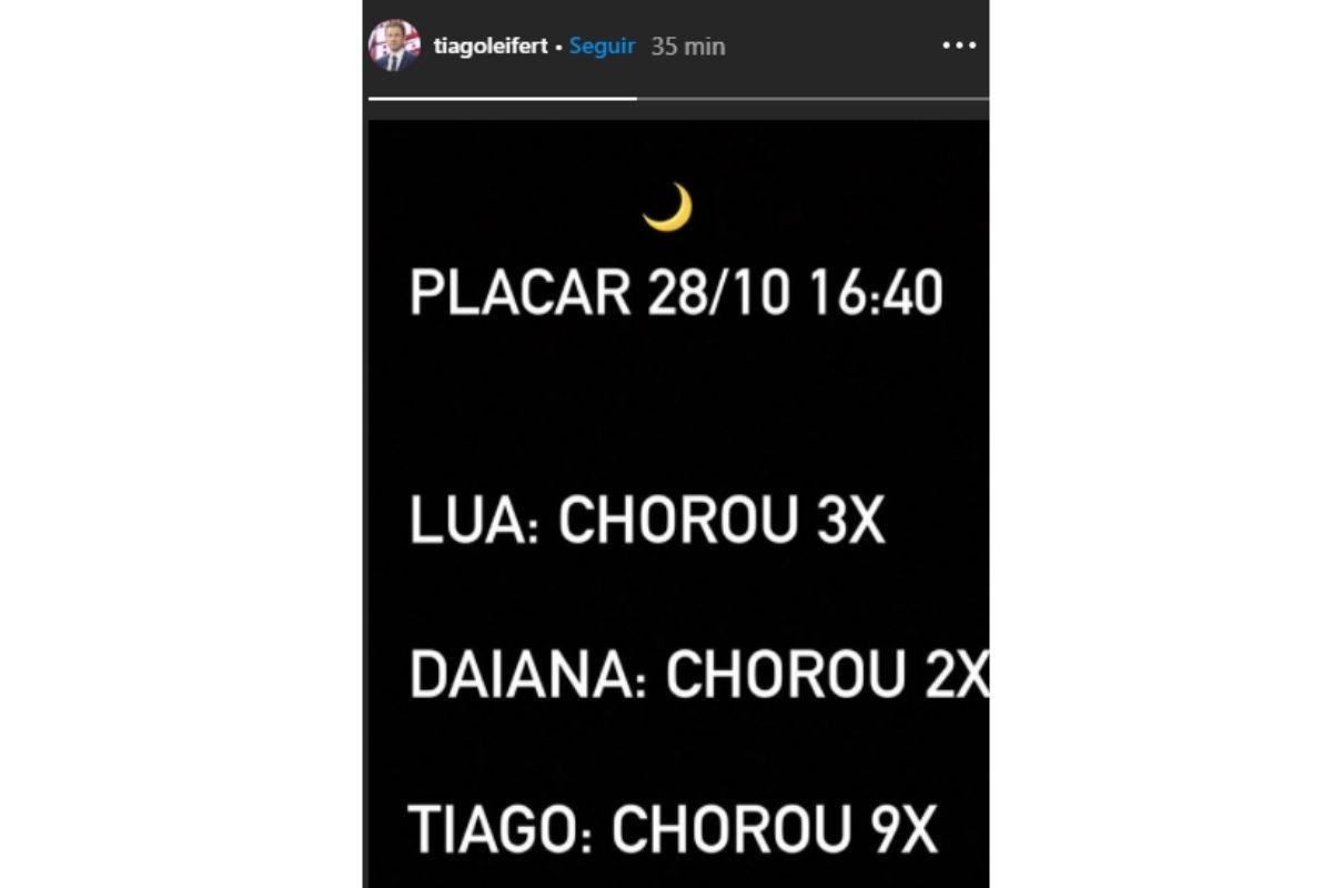Nos stories, o jornalista publicou um “Placar” com a quantidade de vezes que cada membro da família tinha chorado. “Lua chorou três vezes, Daiana chorou duas vezes, Thiago chorou nove vezes”, escreveu ele.