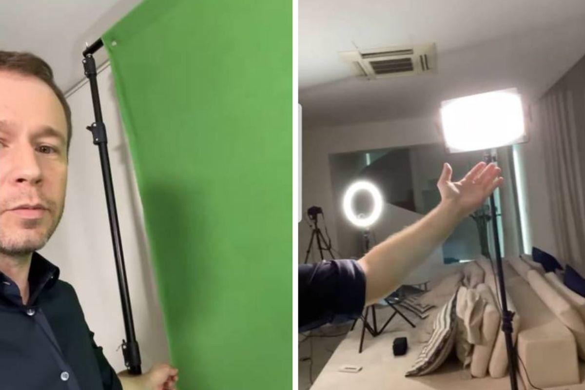 Motivado pela pandemia da Covid-19, o jornalista optou por fazer alguns dos trabalhos de maneira remota. Thiago filmou a tela verde que colocou em uma das paredes para usar como chroma key, técnica usada para projetar imagens, a nova câmera e as luzes especiais do ambiente.