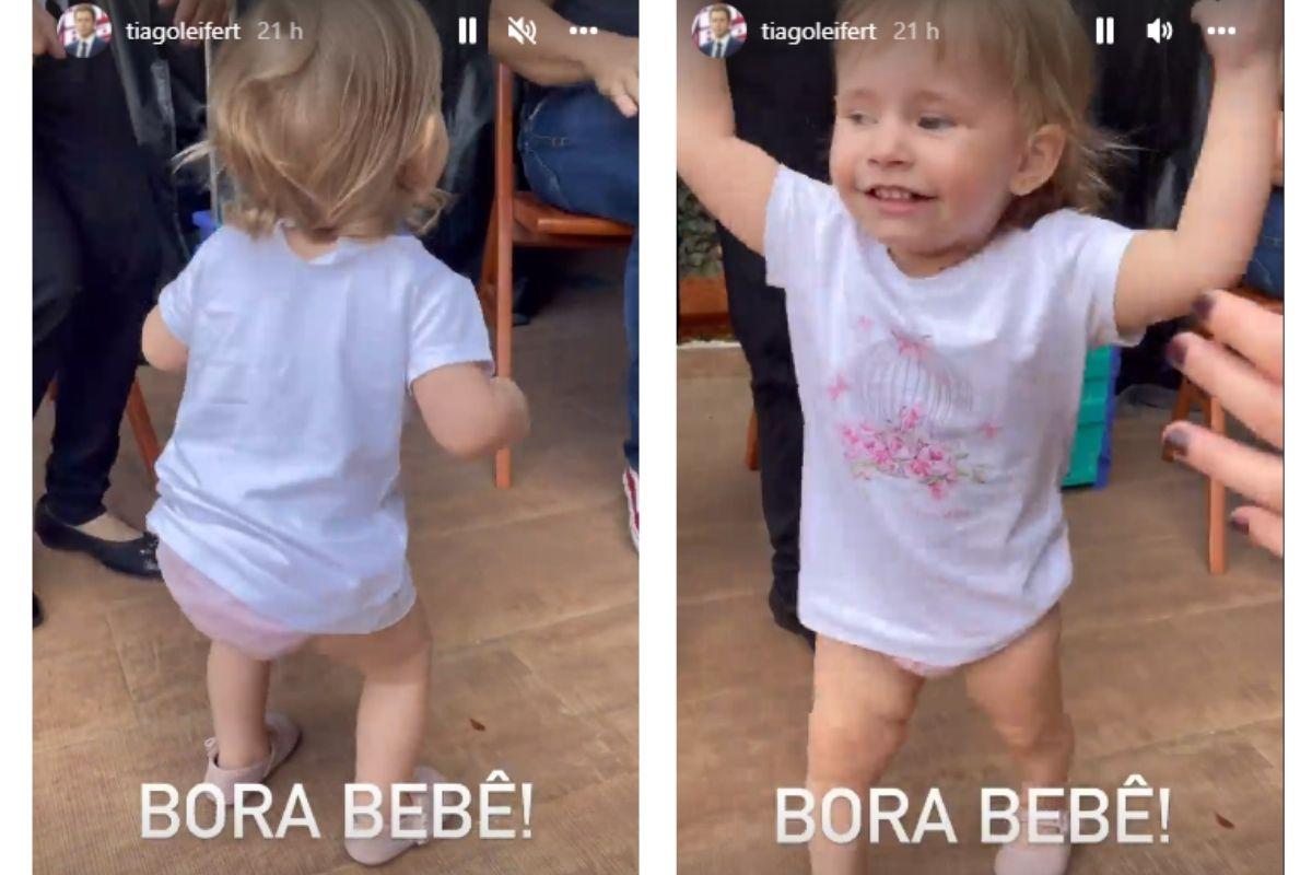Ao compartilhar as imagens, Tiago mostrou que também amou o momento. “Bora, bebê!”, escreveu ele, ao mostrar os vídeos em que ela aparece com uma blusa branca brincando com a família e dançando.