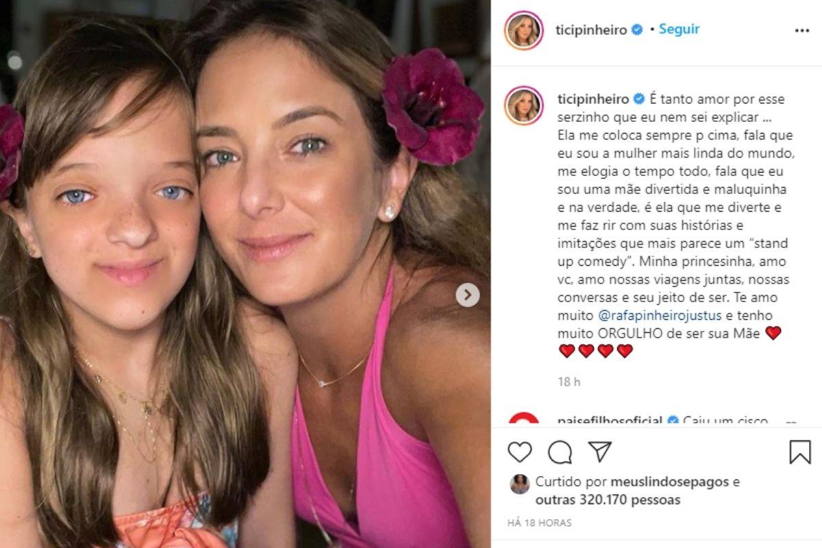 Rafa tem 11 anos e é fruto do antigo casamento de Ticiane com o empresário Roberto Justus. “Minha princesinha, amo você, amo nossas viagens juntas, nossas conversas e seu jeito de ser. Te amo muito e tenho muito orgulho de ser sua mãe”, finalizou.