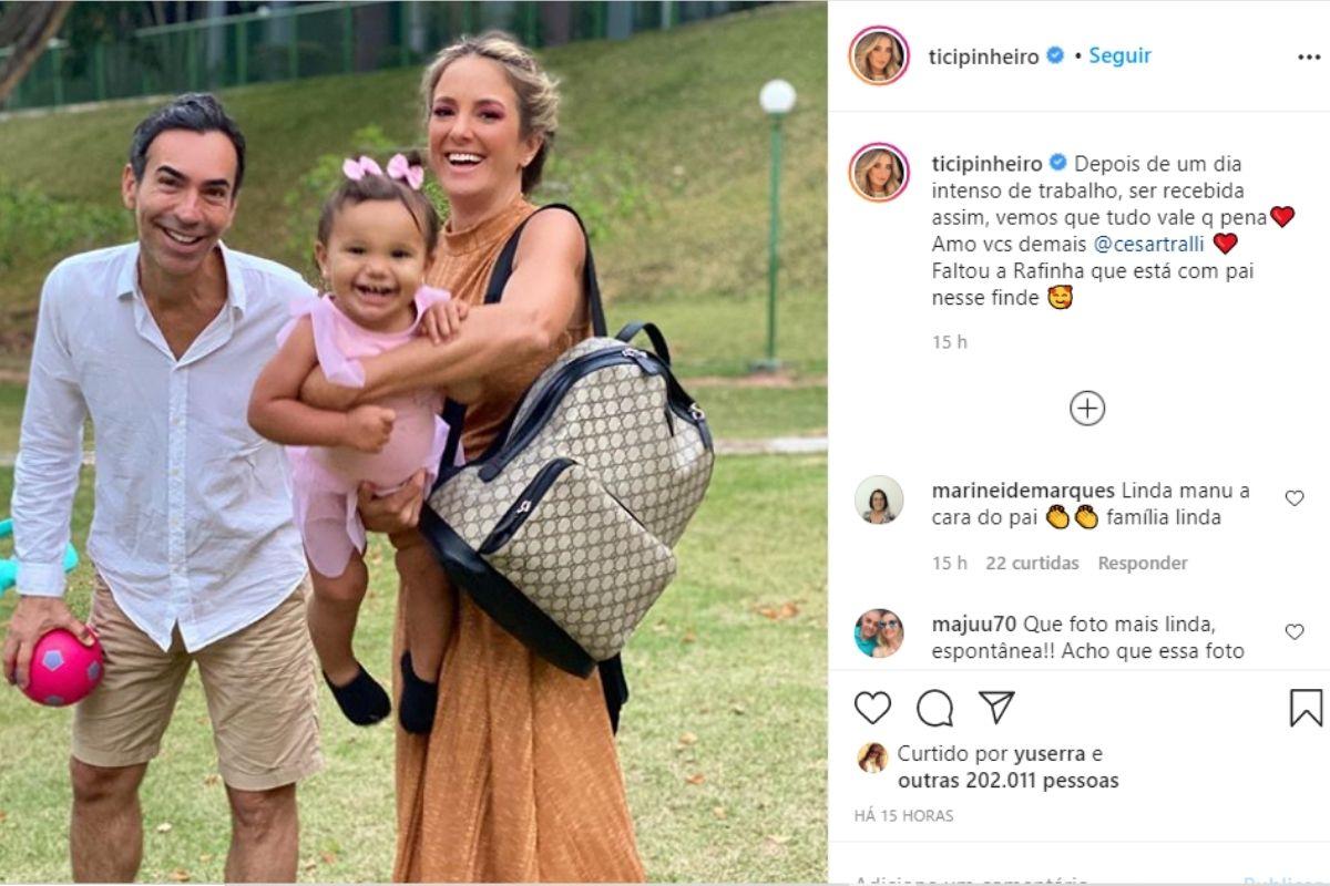 Neste sábado, 12 de setembro, a apresentadora Ticiane Pinheiro compartilhou um momento cheio de amor ao lado da família, nas redes sociais. Na imagem, a mãe aparece chegando em casa após o dia de trabalho e sendo recebida pelo marido, Cesar Tralli, e a caçula, Manuella, 1 ano.