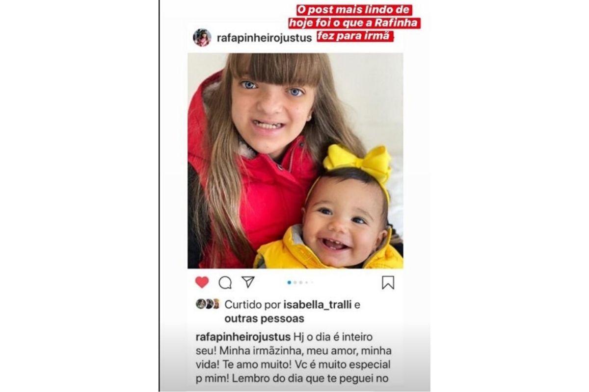 “O post mais lindo de hoje foi o que Rafinha fez para irmã”, escreveu junto ao print de tela, compartilhado nos Stories do Instagram. A garota compartilhou uma foto segurando a irmã no colo e, junto da imagem, publicou um texto parabenizando-a.