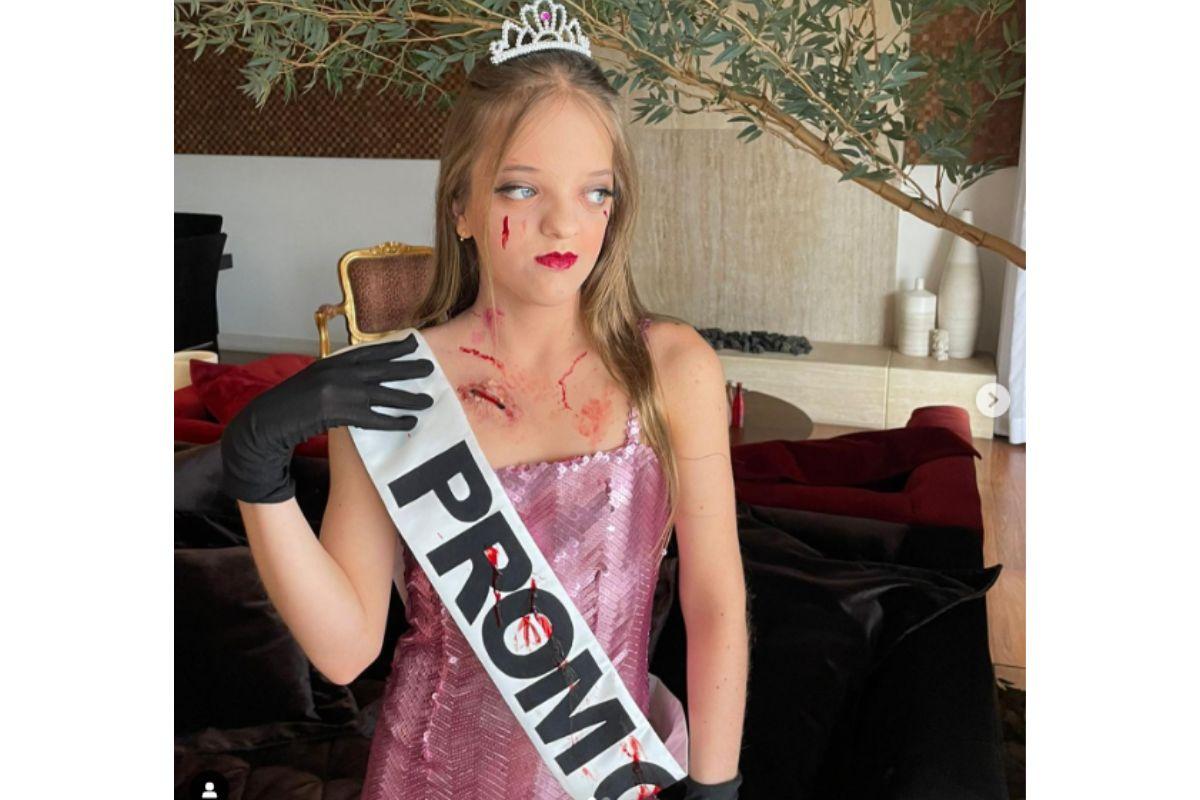 Nesta segunda-feira, dia 31 de outubro, a filha da apresentadora Ticiane Pinheiro e do empresário Roberto Justus, Rafaella Justus, de 13 anos, compartilhou no feed do Instagram um vídeo mostrando o look do Halloween dela. Na gravação ela aparece usando um vestido rosa de paetê, com uma coroa, luvas e para completar o look,ela vestiu uma faixa de “rainha do baile”. Além disso, para entrar mais no tema ela estava com com alguns machucados falsos, feitos com maquiagem e sangue falso.
