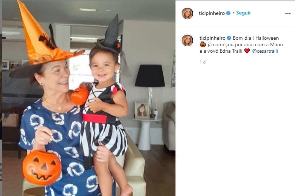 Na imagem, a irmã de Rafa Justus aparece bem sorridente no colo da avó paterna, Edna Tralli. Manu veste um chapéu de bruxa e segura uma abóbora de brinquedo nas mãos, assim como a mãe de César. “Halloween já começou por aqui com a Manu e a vovó Edna Tralli”, escreveu Ticiane na legenda da publicação.