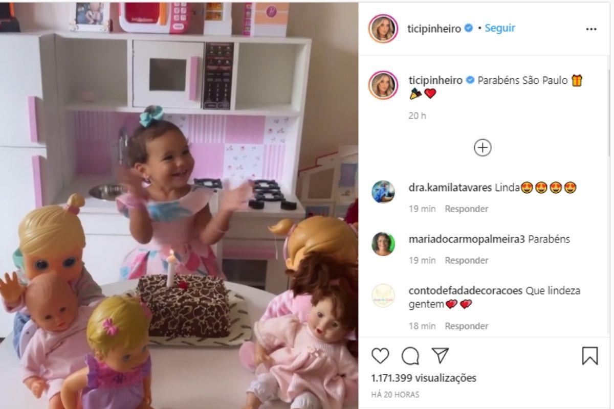 Na imagem, Manu surge toda sorridente batendo palmas e cantando parabéns para a cidade de São Paulo, que completou 467 anos! A comemoração teve direito a bolo e até convidadas especiais: as bonecas! Ao mostrar a linda cena, a apresentadora disse: “Parabéns São Paulo”.