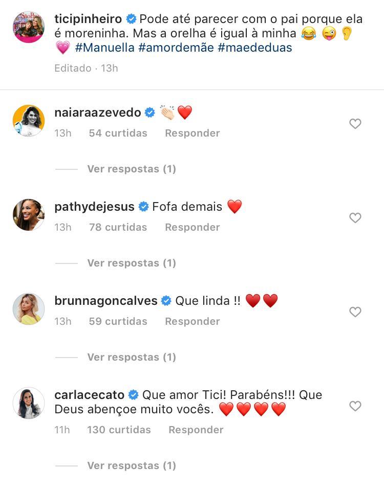 Famosas como Sabrina Sato, Naiara Azevedo, Carla Cecato e Patricia Dejesus comentaram a foto prestigiando Tici pela filha.