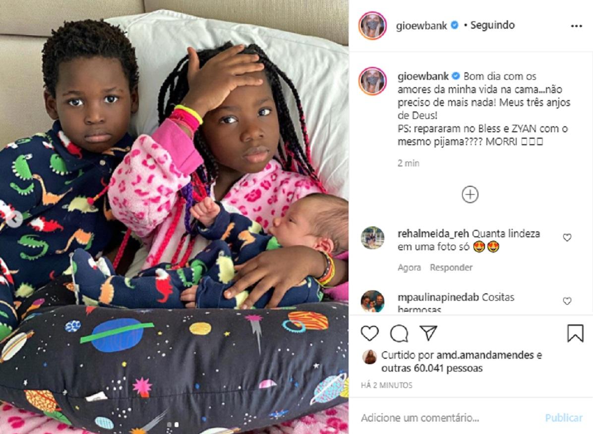 Nesta quinta-feira, 13 de agosto, Giovanna Ewbank compartilhou um momento único de Zyan, Bless e Titi nas redes sociais! As crianças são fruto do relacionamento com Bruno Gagliasso. Ainda na cama, ela mostrou os três juntinhos e destacou o pijama combinando dos meninos. A gente amou!