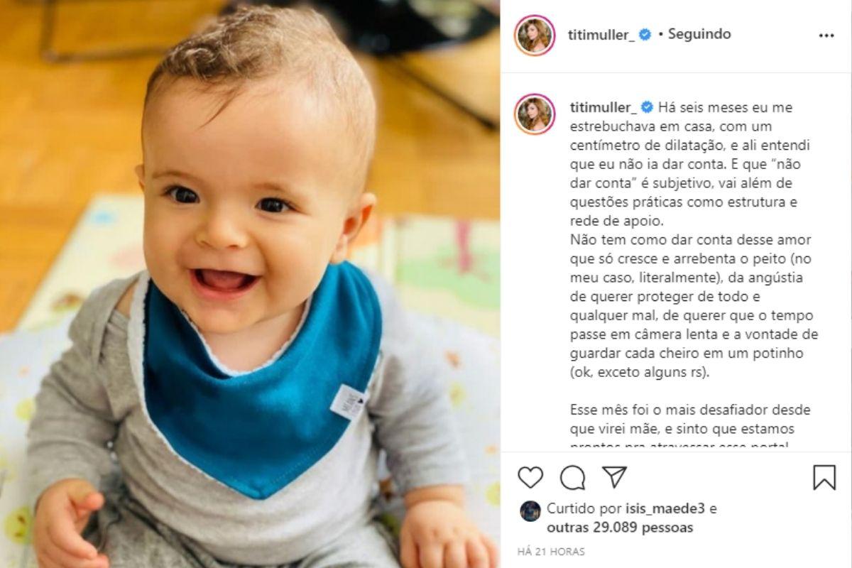 Nesta segunda-feira, 18 de janeiro, Titi Müller usou o Instagram para falar sobre maternidade real e fez um relato sobre a própria exaustão por conta da rotina após o nascimento do filho Benjamin, de 7 meses. A atriz disse que sente prazer em ser mãe, mas ressaltou que também é cansativo.