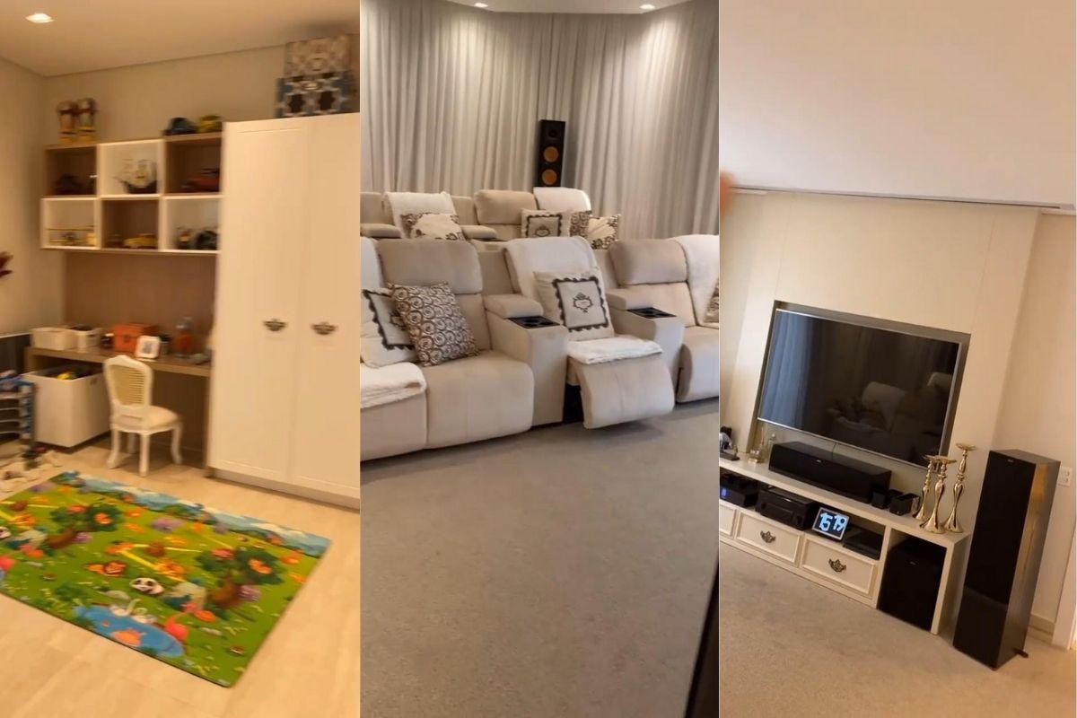 Na sequência, o arquiteto mostra a brinquedoteca dos filhos de Simone e Kaká Diniz, Zaya e Henry. Alexandre também mostrou a sala de cinema, que conta com sofás e uma Televisão grande, perfeito para maratonar filmes e séries.