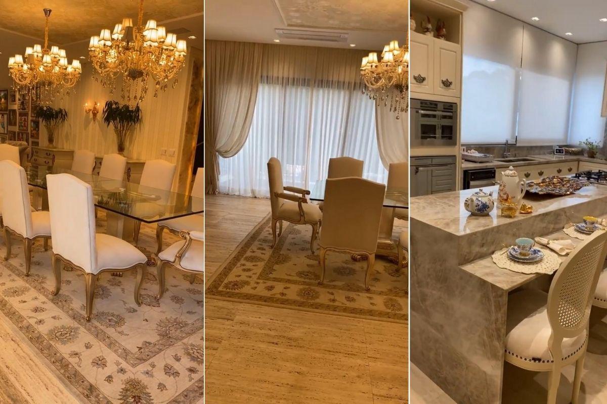 Nos vídeos, Alexandre mostrou todos os cômodos da gigantesca e luxuosa residência. Começando pelas salas de estar e jantar. Com direito a lustres e decoração caprichada, o local conta com tons bege e detalhes dourados, a cozinha tem estilo americana e possui tons mais claros.