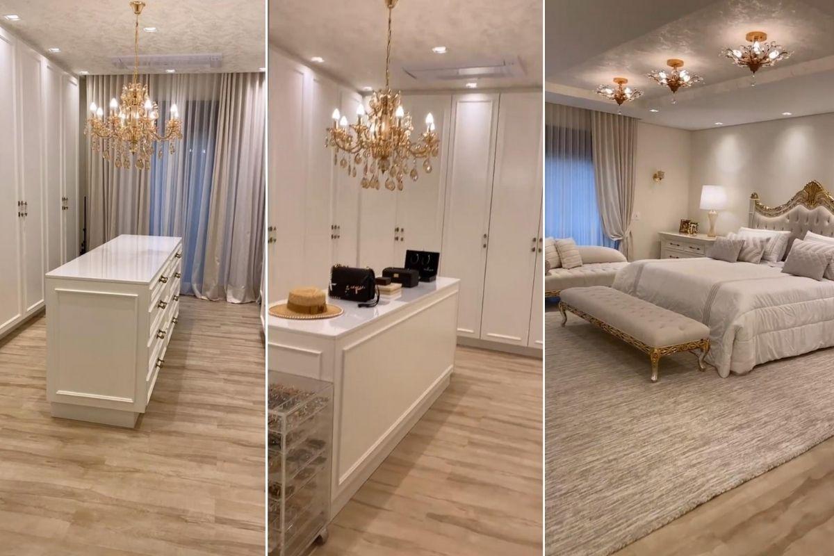 Já a suíte do casal, conta com dois closets, um de Kaká Diniz e outro da cantora! O closet de simone conta com diversas joias e acessórios, além de um lindo lustre no centro do cômodo. Além disso, o local conta com papeis de parede no teto e uma luxuosa cama de casal.