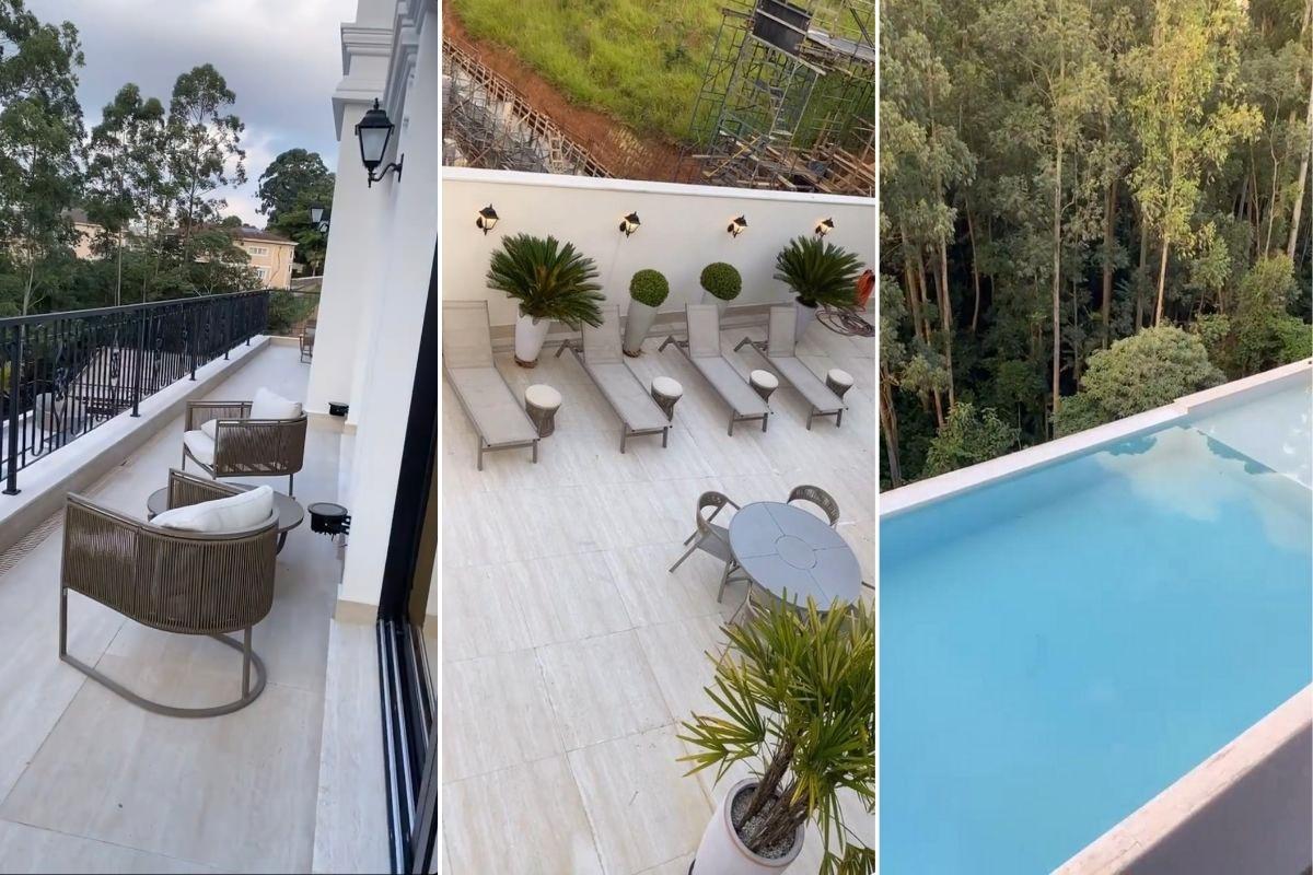 A sacada da mansão conta com bancos, mesas e uma vista maravilhosa para uma área arborizada do condomínio em que a família mora! Além disso, é possível ver a piscina enorme da residência e uma aérea de lazer perfeita para pegar um sol.