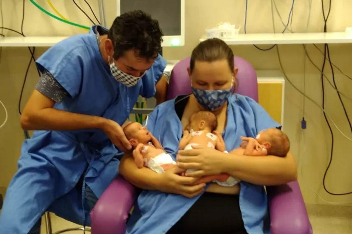 A mãe deu à luz aos trigêmeos idênticos na quinta-feira, 29 de outubro, em Blumenau, Santa Catarina. Taiza Priscila Kruger, de 29 anos, e o marido, Itamar Antunes, não fizeram nenhum tratamento para fertilidade e nem tinham filhos antes. A concepção natural de Thomas, Gael e Davi foi um susto para a família.