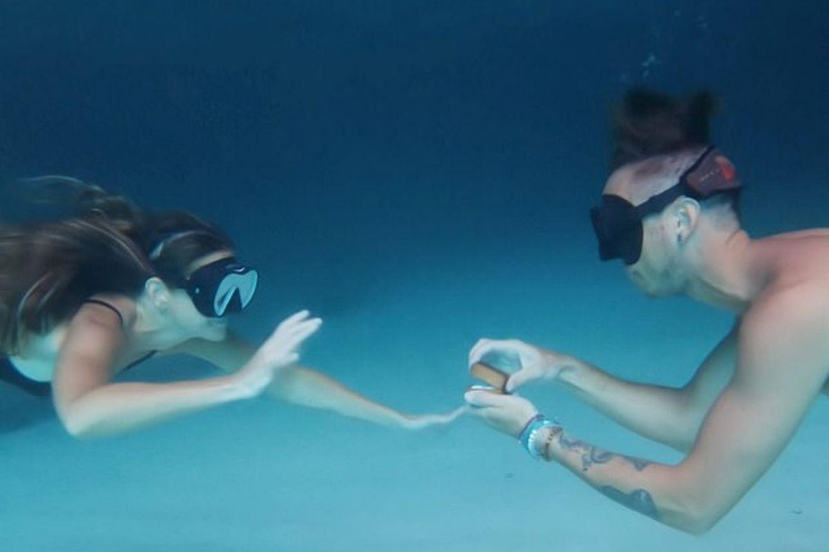 Nada de um jantar à luz de velas por aqui! Um homem pediu à noiva em casamento durante um mergulho no fundo do mar. Kody Workman, de 33 anos, fez a pergunta a Kelly Castille, de 34, quando o casal estava a 3 metros de profundidade em uma enseada pitoresca em Negril, Jamaica. O fotógrafo e cinegrafista presenteou a parceira com um anel enquanto eles estavam nadando no exótico destino de férias.