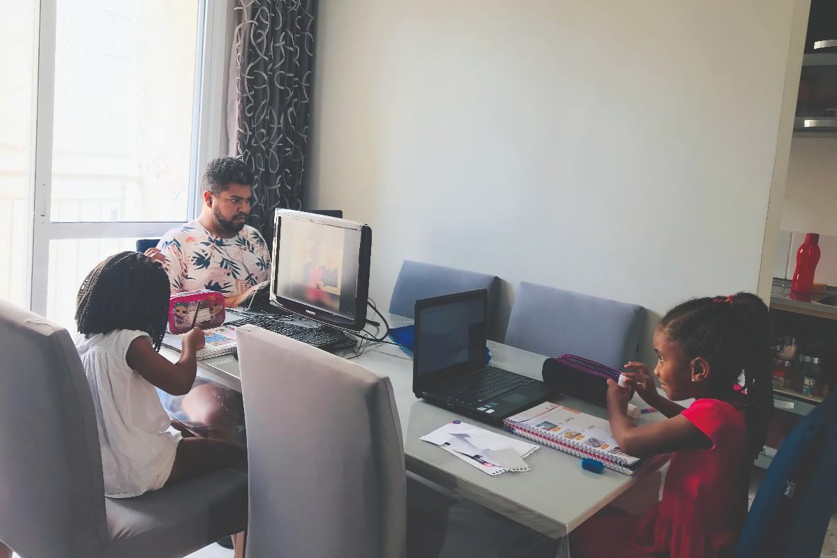 Início da rotina de aula das meninas, enquanto o pai fica por perto lendo os emails , também está atento a qualquer necessidade de ajuda que as lições demandem.