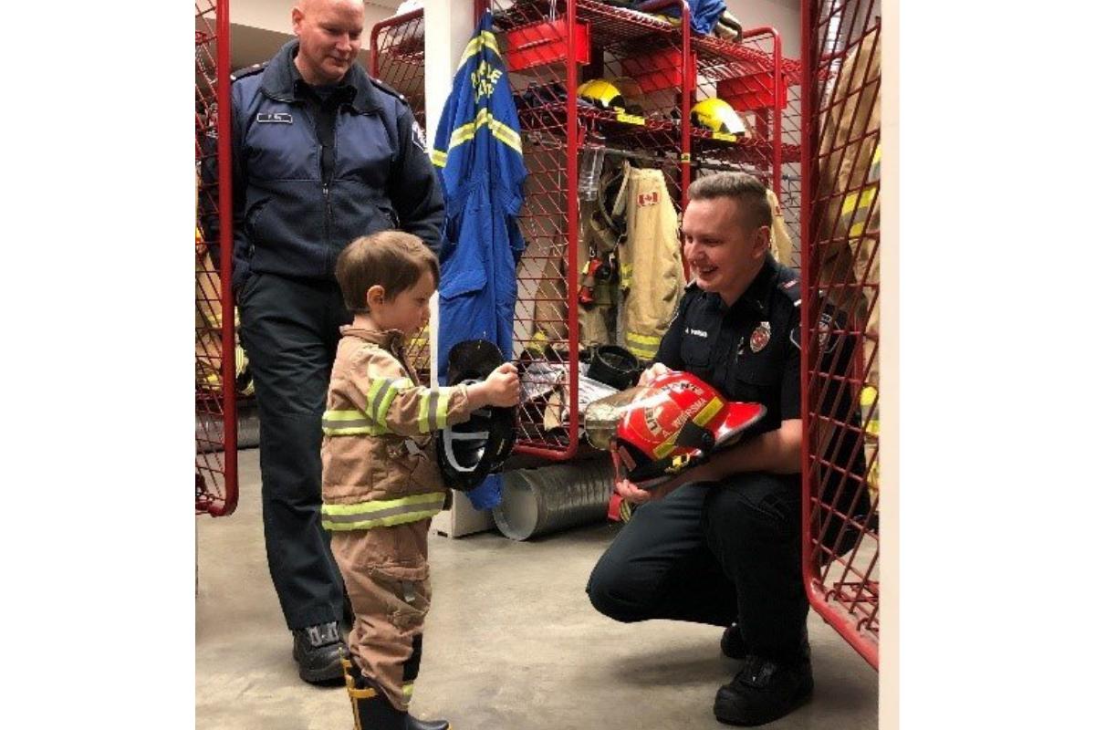 Para o menino de três anos, a visita foi incrível! Ele fez um tour pelo Corpo de Bombeiros e recebeu um capacete vermelho, um urso de pelúcia, biscoito e um certificado reconhecendo seu status como membro júnior oficial.