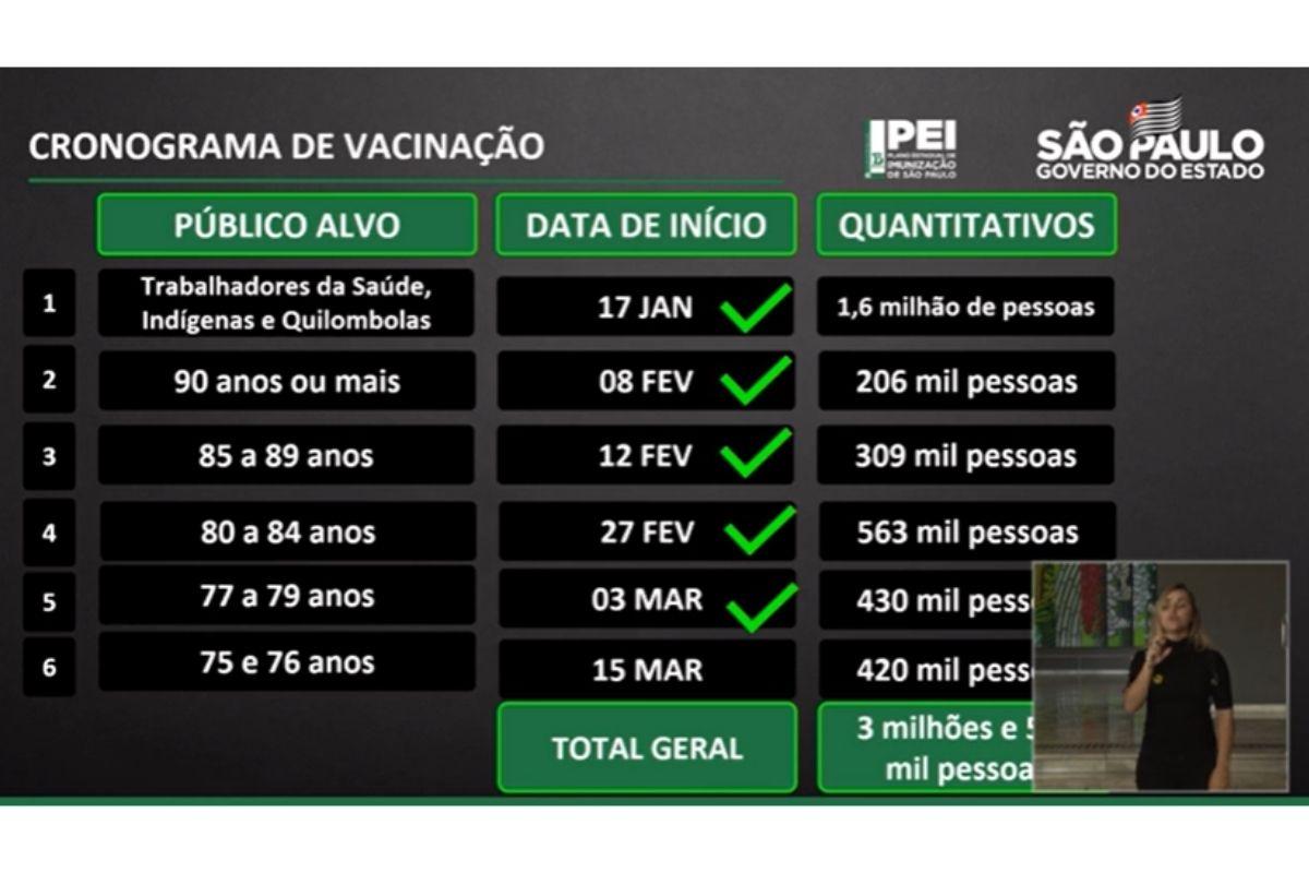 Na próxima semana, os idosos de 75 e 76 anos serão vacinados a partir da segunda-feira, dia 15 de março. Ao todo, essa faixa etária representa 420 mil pessoas. Vale lembrar que a vacinação acontece nos pontos drive-thru , além das Unidades Básicas de Saúde das 08h às 17 horas.