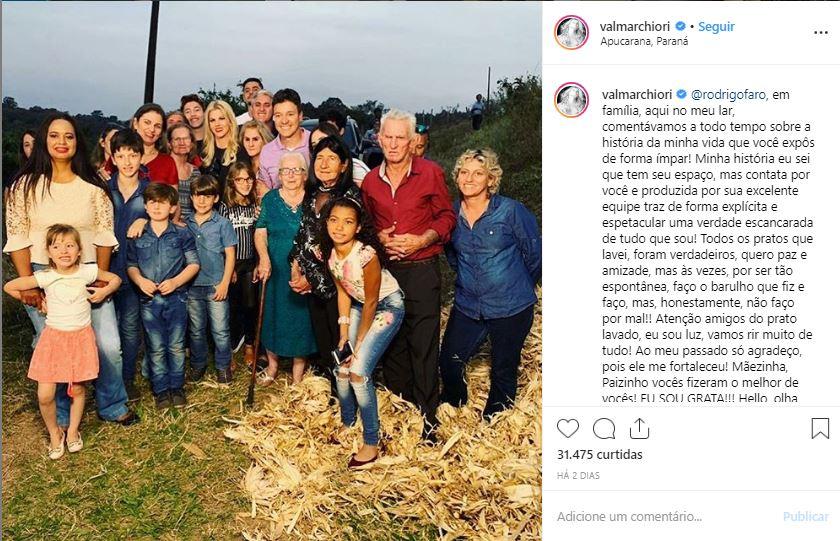 Após o programa, Val publicou uma foto com a família inteira no Instagram e se declarou na legenda da publicação. “Rodrigo Faro, aqui em casa nos comentávamos o tempo todo sobre a história da minha vida que você expôs de forma ímpar. Minha história contada por você e produzida por sua excelente equipe, traz de forma explícita e espetacular uma verdade escancarada de tudo que eu sou”, diz a apresentadora. “Ao meu passado só agradeço, pois ele me fortaleceu! Mãezinha, paizinho, vocês fizeram o melhor de vocês. EU SOU GRATA! Obrigada vida! Obrigada, Deus!”, finalizou Val.