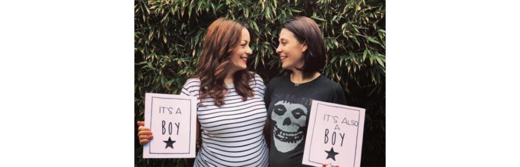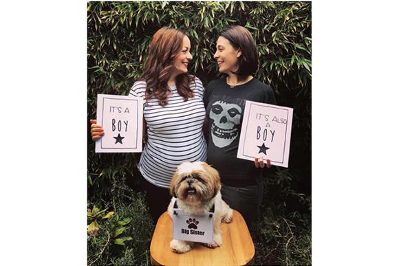 Toby Fleischman e Lindsay Lanciault, têm o privilégio de passar pelo período da gravidez juntas. As duas vão sentir enjoos, desejos, e o bebê se mexer na barriga. Toby compartilhou em seu instagram uma foto anunciando o sexo dos bebês. Lindsay segura uma placa escrito “é um menino”, e Toby uma com: “também é um menino”! O registro ficou ainda melhor com a presença da cachorrinha do casal com uma plaquinha informando: “irmã mais velha”.