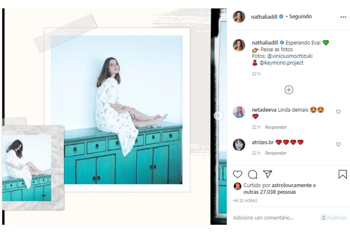 A atriz Nathalia Dill usou as redes sociais nesta sexta-feira, 16 de outubro, para compartilhar algumas fotos do ensaio que fez na reta final da gestação. A famosa está na 30° semana da gravidez, fruto do relacionamento com o músico Pedro Curvello. “Esperando Eva!”, escreveu a famosa ao publicar as fotos, feitas pelo fotógrafo Vinícius Mochizuki.