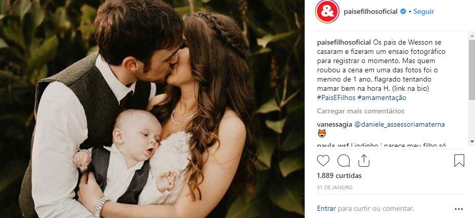 Casamento sempre rende ótimas fotos, mas nesse caso a fotógrafa conseguiu registrar o momento certinho em que o bebê tentava mamar. Muito bom!