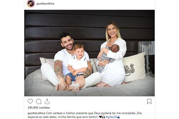 Na postagem, Gustavo Lima aparece na cama com sua mulher, Andressa Suita, e seus dois filhos (lindos!) Gabriel, que está com 1 ano, e Samuel, com menos de dois meses. A legenda veio para completar esse momento delícia: “Com certeza o melhor presente que Deus poderia ter me concedido…Dia especial ao lado deles, minha família que amo tanto!!!”. Família é tudo!