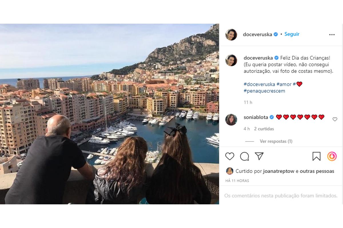 “Feliz Dia das Crianças! (Eu queria postar vídeo, não consegui autorização, vai foto de costas mesmo)”, escreveu ela, brincando com o fato das filhas não deixarem postar vídeos.