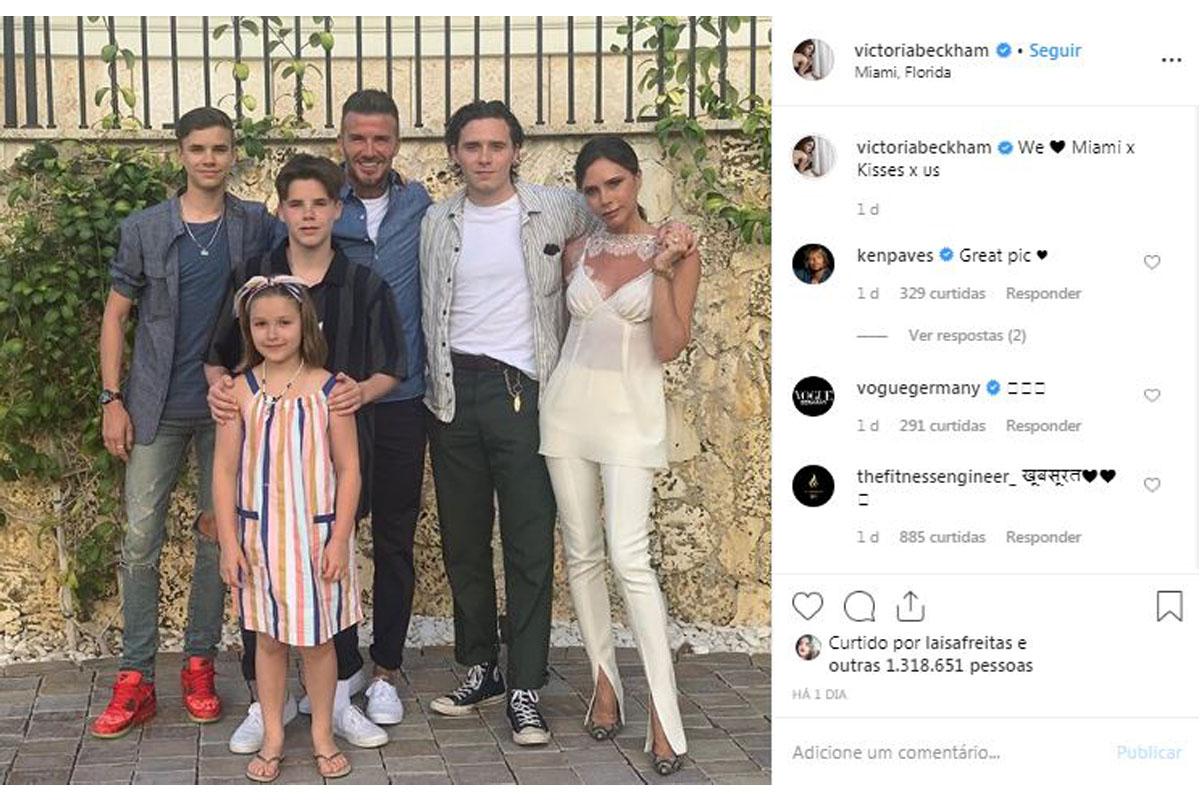 Victoria Beckham, mãe de Brooklyn Beckham, Harper Beckham, Cruz Beckham e Romeo Beckham, postou uma rara de toda a família reunida. Ela e o marido, o jogador David Beckham, estão com os quatro filhos em uma viagem a Miami, Estados Unidos.