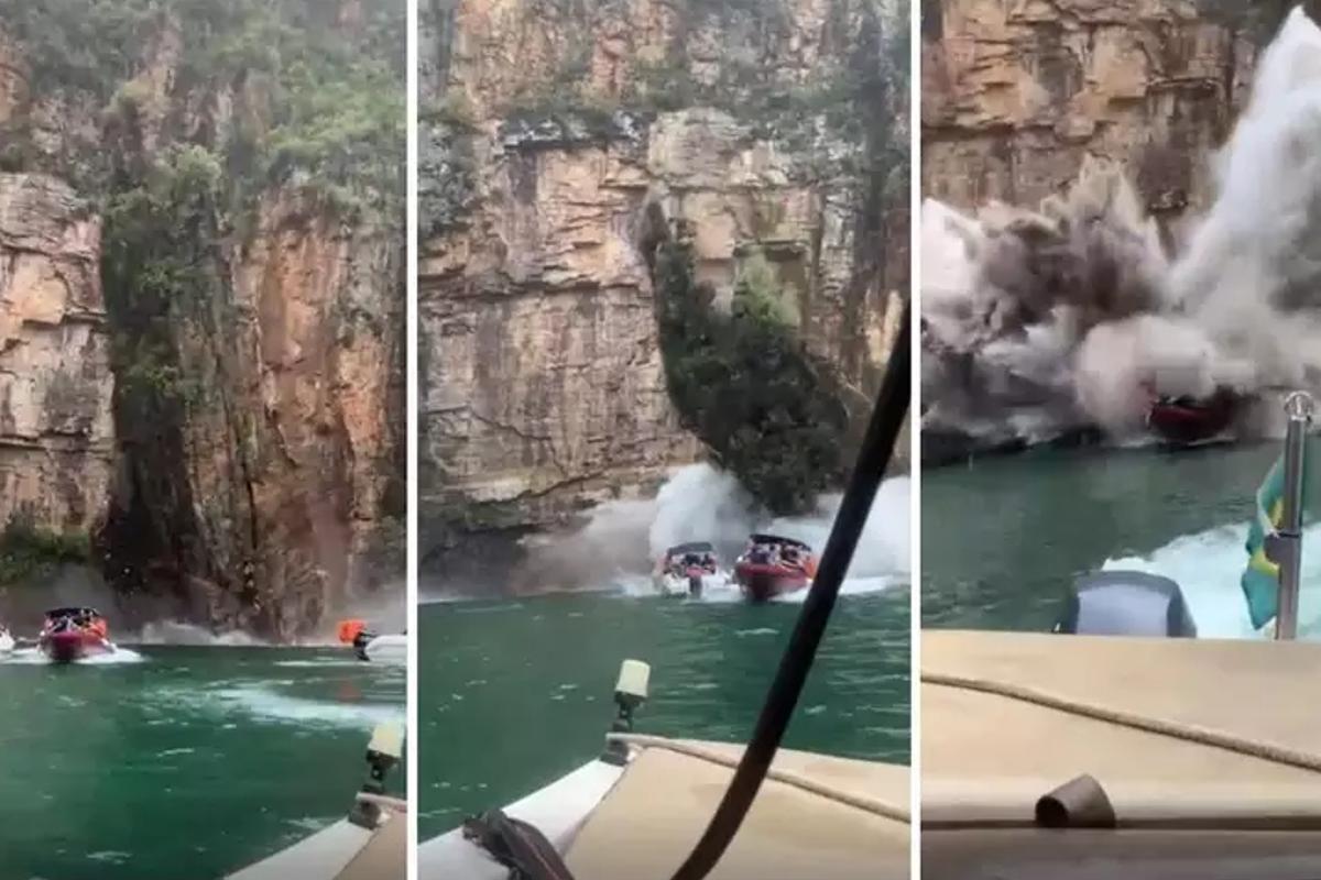 Um vídeo impressionante mostra o momento exato em que a rocha se solta e despenca sobre as embarcações que estavam na água.