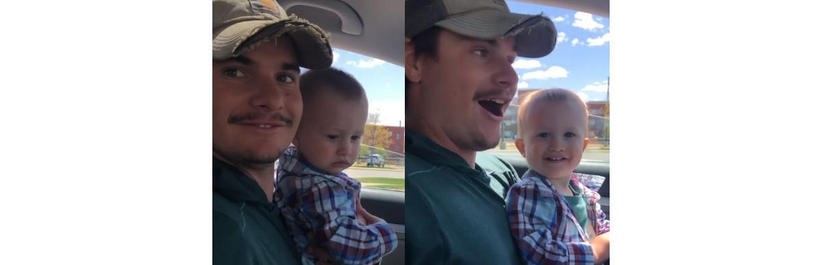 O bebê no colo do pai também ri com a situação. Então o pai também começa a rir e se empolga explicando para o filho que será o irmão mais velho de três. “O que vamos fazer? A casa nem é grande o suficiente para nós!”, continua.