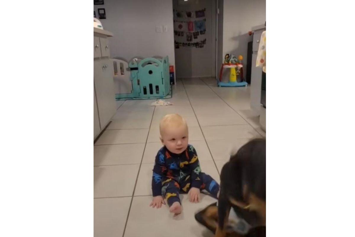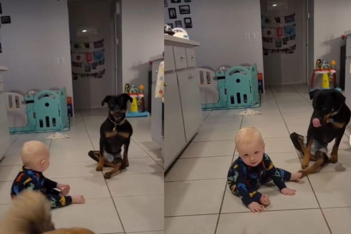 Uma Rottweiler viralizou no TikTok após protagonizar momento impressionante junto a bebê. O animal que possui paralisia estava ao lado dele quando começou a tentar ensinar a criança a engatinhar.
